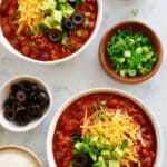 Ladle the chili into bowls and top with your favorite garnishes. I’m a big fan of sour cream, shredded cheddar cheese, sliced scallions, and diced avocado for a creamy, fresh contrast to the spicy warmth of the chili. But go with whatever makes you happy—chili is all about comfort!