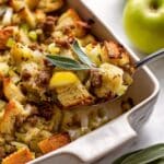 This Apple & Sausage Stuffing recipe is a delicious blend of savory Italian sausage, crisp celery and onion, fresh sage, and sweet Granny Smith apples, combined with crusty toasted bread cubes and baked to golden perfection. Perfect as a comforting side dish for Thanksgiving or any festive meal, it offers a harmonious balance of flavors and textures with a moist, fluffy interior and a crisp top. Easy to prepare and can be made ahead, this stuffing is sure to impress your guests with its traditional yet vibrant taste.