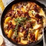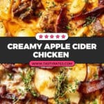 Apple Cider Smothered Chicken is a cozy, flavorful one-pot meal perfect for fall. Tender thin-cut chicken breasts are seasoned, dredged, and seared with prosciutto for a crispy, savory bite. The dish is then smothered in a caramelized onion, garlic, apple cider, and cream sauce with fresh herbs and sweet Honeycrisp apple wedges, topped with melted Gruyère cheese and crispy prosciutto pieces. This easy recipe combines comforting, rich flavors with a touch of sweetness, ideal for an impressive yet simple weeknight dinner.