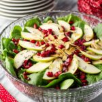 - Assemble the Salad: In a large bowl, combine baby spinach and thinly sliced apple. Drizzle ¼ cup of the dressing over the greens and apples, tossing gently to coat. Top with plumped dried cranberries, pomegranate arils, and honey-roasted almonds. Toss lightly before serving and offer extra dressing at the table.