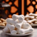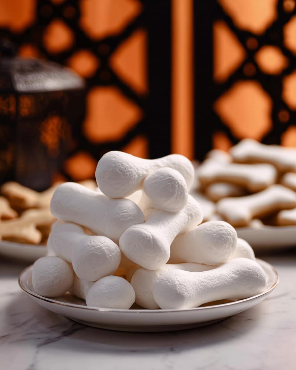 A close-up view of a white plate filled with soft, white marshmallows shaped like bones, stacked on top of each other showing their smooth and slightly rounded ends, with another plate in the background blurred and filled with light brown cookies that resemble fingers, all set on a white marbled textured surface. photo taken with an iphone --ar 4:5 --v 7