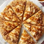 Finally, sprinkle the streusel topping across the apple layer. Pop the pizza into your preheated oven and bake for 20 to 25 minutes until the crust is beautifully golden brown and the streusel looks irresistible.