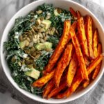 A vibrant and creamy Avocado Kale Caesar Salad paired with crispy sweet potato fries. This nutritious and flavorful dish features fresh kale tossed in a rich avocado-based Caesar dressing, topped with Parmesan and crunchy pepitas, making it a perfect healthy meal or side.