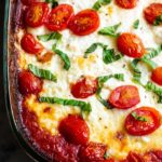 Spoon the cheese mixture right into the center of the sauce, leaving about an inch of sauce visible around the edges. Spread it evenly with a fork or spoon, then scatter the halved tomatoes on top and drizzle with olive oil to help them roast beautifully. Pop the whole dish into your preheated oven and bake for 20-25 minutes until the cheese is golden and bubbly and the sauce is sizzling.