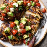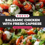 Balsamic Chicken With Caprese Salsa features tender, juicy chicken breasts marinated in a flavorful balsamic and lemon mixture, pan-seared to perfection, and topped with a fresh, vibrant caprese salsa made of cherry tomatoes, avocado, mozzarella pearls, basil, and shallots. This dish balances savory, tangy, and creamy textures for a delightful meal.