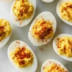 Honestly, I don’t freeze deviled eggs because the texture of the whites changes when frozen. If you want to prep ahead, boil and peel the eggs in advance and keep the filling separate in the fridge—they’ll taste so much fresher that way.