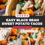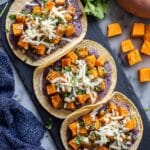 These Vegetarian Black Bean Sweet Potato Tacos are a flavorful and nutritious meal perfect for lunch or dinner. Tender sweet potatoes cooked with onions and garlic are combined with creamy refried black beans, then layered in warm corn tortillas and topped with fresh cilantro and Monterey Jack cheese. This easy skillet recipe comes together quickly and makes great meal prep for busy weeknights.