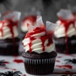 Bloody Broken Glass Cupcakes feature a rich black cocoa cupcake base filled with creamy white chocolate ganache ‘blood’. They are topped with smooth white chocolate buttercream, shards of edible sugar glass, and a drizzle of edible fake blood for a spooky and dramatic dessert perfect for Halloween or themed parties.