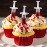 - Garnish: Drizzle additional strawberry coulis over the buttercream and place syringes filled with coulis on top of the cupcakes for a bloody effect.