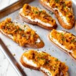 I’ve frozen the roasted squash and caramelized shallot mix before without issue — just thaw overnight in the fridge and reheat gently. The texture holds up well, though the crostini are best fresh toasted for maximum crispness.