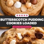 Delightfully soft and tender Butterscotch Pudding Cookies loaded with butterscotch chips, chocolate chips, and white chocolate chips. These melt-in-your-mouth cookies combine the rich flavor of butterscotch pudding mix with a perfect balance of sweetness and texture, making them an irresistible treat for cookie lovers.