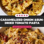 A rich and flavorful Caramelized Onion and Sun-Dried Tomato Pasta featuring tender farfalle tossed in a creamy cashew sauce with sweet caramelized onions, aromatic thyme, and vibrant spinach. This indulgent yet simple dish is perfect for a comforting vegetarian meal.