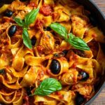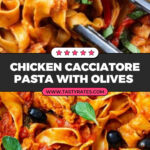 Chicken Cacciatore Pasta features tender braised chicken thighs simmered in a rich tomato sauce with red bell peppers, olives, and capers, served over wide pappardelle noodles. This hearty Italian-inspired dish balances savory, tangy, and aromatic flavors for a comforting yet elegant meal.