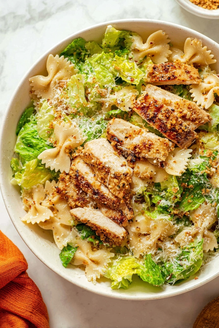 A flavorful and satisfying Chicken Caesar Pasta Salad featuring tender pan-seared chicken, al dente farfalle pasta, crisp Romaine lettuce, and a creamy Caesar dressing. Topped with golden garlicky breadcrumbs and Parmesan cheese, this salad is perfect served immediately or chilled for a refreshing meal.
