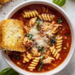 This Chicken Parmesan Soup is a comforting and flavorful dish combining tender baked chicken, hearty pasta, fire roasted tomatoes, and melty mozzarella croutons. A delightful twist on classic chicken parmesan, this soup is perfect for a cozy meal that’s easy to prepare and packed with savory Italian-inspired flavors.