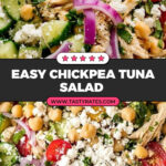 This vibrant Chickpea Tuna Salad combines protein-rich chickpeas and albacore tuna with fresh vegetables like cherry tomatoes, cucumber, and red bell pepper, tossed with a zesty lemon garlic dressing and topped with feta and parsley. It’s a quick, healthy, and flavorful salad perfect for a light lunch or dinner.