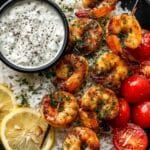 I like to toss cherry tomatoes with a spoonful of the leftover chimichurri—this brings a fresh, acid-bright component that complements the shrimp beautifully. Then, plate everything up with a generous mound of fluffy rice, the juicy tomatoes, succulent shrimp, and a cool dollop of tzatziki on the side. It’s such a bright, colorful, and balanced plate that your taste buds will thank you for.