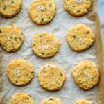 Preheat your oven to 350˚F (175˚C). Unwrap the chilled dough and cut it into 1/2-inch thick slices. Lay them on a baking sheet lined with parchment paper or a silicone baking mat. To get evenly flat crackers, I gently press each slice with the bottom of a measuring cup or mug—just a light touch to keep them proud but uniform in thickness. If you love that salty crunch, sprinkle some flaked sea salt on top now.