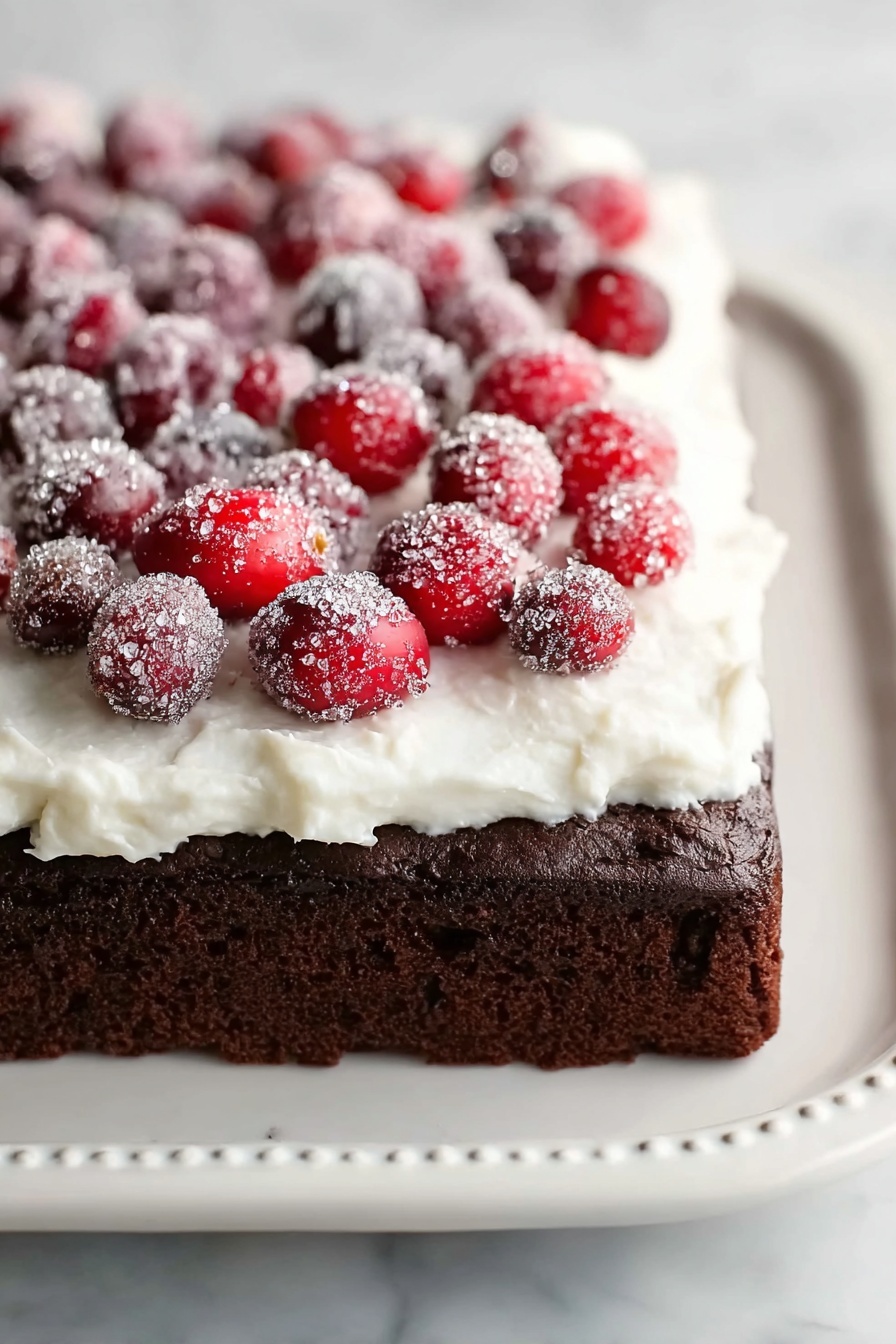 Spread the frosting gently over your cooled cake. Then, scatter spiced sugared cranberries on top for a festive pop of color and flavor. The tartness of the cranberries balances the richness wonderfully—I discovered this combo during last year’s holidays and it quickly became a family favorite.