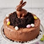 - Decorate: Place the chocolate bunny on top of the frosted cake, arranging mini eggs around it to create the effect of a bunny burrowing into a hole. Chill the cake briefly if needed to set the frosting before serving.