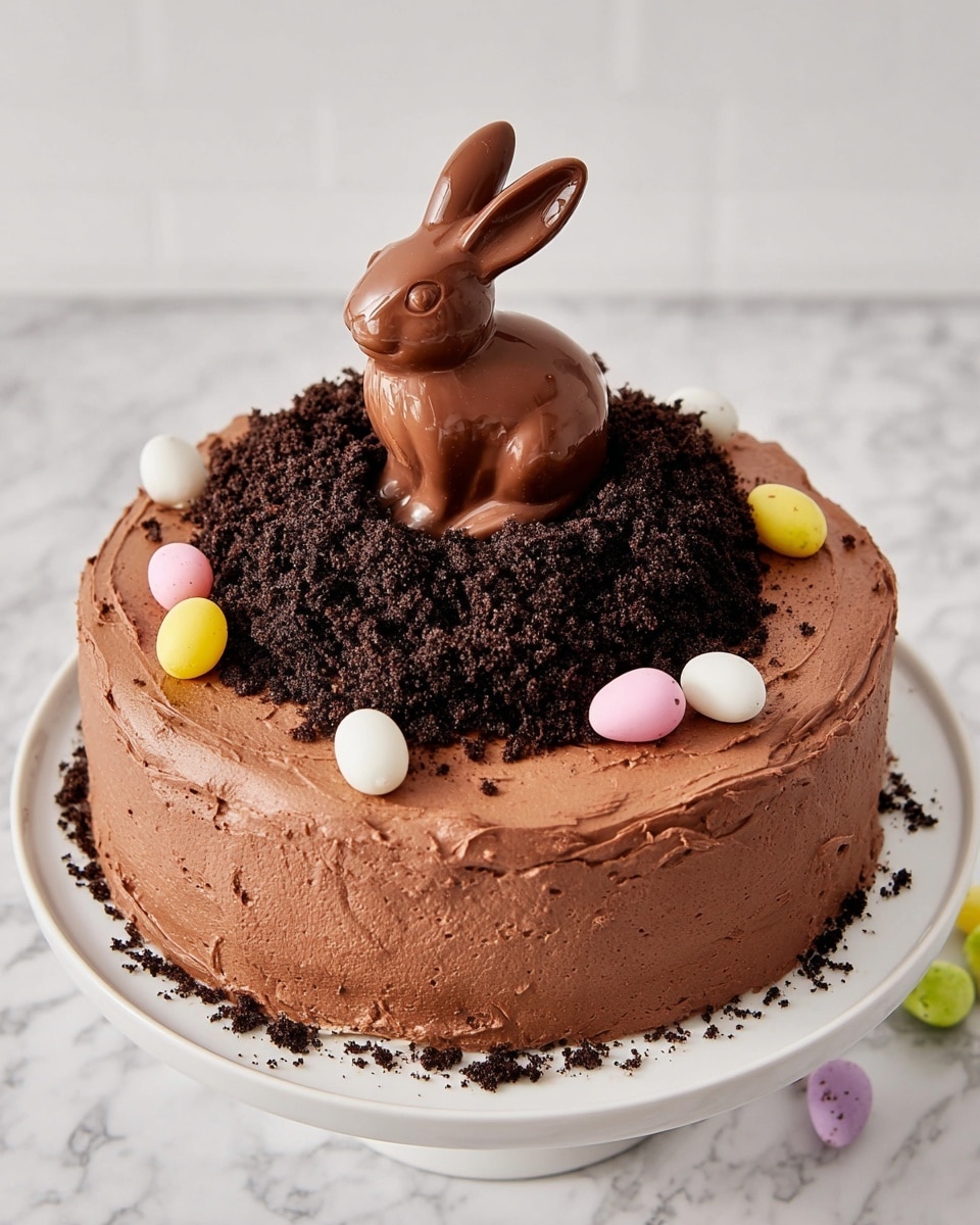 - A deliciously soft chocolate cake with a chocolate buttercream frosting and topped with a chocolate bunny rabbit burrowing into a hole! Perfect for Easter!