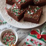 Fudgy and dense homemade brownies made with semi-sweet chocolate and topped with a rich, creamy chocolate frosting. These Chocolate Frosted Christmas Brownies are perfect for holiday celebrations, featuring a moist texture and festive sprinkles to brighten any sweets table.