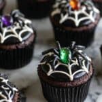 If you have leftovers (and I hope you do!), store the cupcakes in an airtight container at room temperature. From experience, decorated cupcakes taste best within a day or two because the frosting stays fresh and the spider decorations hold up beautifully.