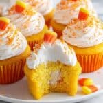 9. Pipe and Decorate: Transfer the frosting to a piping bag fitted with a large tip. Pipe generous swirls onto each cooled cupcake. Top with candy corn and a sprinkling of orange and yellow sprinkles for festive decoration.