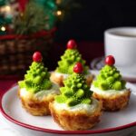 - Assemble and Serve: Remove the mini quiches from the oven and let them cool in the muffin tray for about 2 minutes to set. Carefully remove them from the tray using a knife or small spatula to loosen the edges. Top each quiche with a decorated Romanesco floret to complete the Christmas tree effect. Serve warm and enjoy your festive, delicious appetizer!