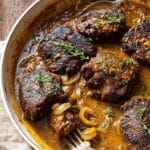 - Finish and Serve: Once the roast is tender, remove from heat and let it rest for 10 minutes before slicing. Serve slices alongside the crispy sage potatoes, spooning some of the braising liquid and caramelized onions over the top for extra flavor.