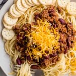 Ladle the rich chili generously over the hot spaghetti. Top with shredded cheddar cheese, drained black and red beans, diced raw onions for crunch, and don’t forget those oyster crackers — they add an addicting crispy texture that my family can’t get enough of.