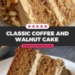 A classic double-layered Coffee and Walnut Cake featuring moist coffee-infused sponge layers filled and topped with rich coffee buttercream icing, decorated with crunchy chopped walnuts for added texture and flavor.