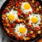 A hearty and flavorful Corned Beef Hash and Eggs recipe featuring tender corned beef, crispy Yukon gold potatoes, sautéed bell peppers and onions, and perfectly cooked eggs. This one-skillet meal is perfect for breakfast or brunch and makes great use of St. Patrick’s Day leftovers.