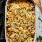 You can swap butter for plant-based margarine and use a plant-based milk like almond or oat milk. Use vegan cheese or nutritional yeast to replicate the cheesy flavor. Also, make sure your breadcrumbs are vegan or omit them for the topping.