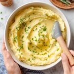 Don’t overwork the potatoes! Mash gently and avoid using a food processor or blender. Using a potato masher or ricer and folding in ingredients carefully is key to fluffy, creamy mashed potatoes.