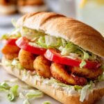 This Shrimp Po Boy Sandwich recipe features crispy fried shrimp nestled in a French roll with shredded lettuce, ripe tomato slices, and a tangy homemade remoulade sauce. Inspired by the classic Louisiana po boy, it offers bold Cajun flavors, a crunchy coating, and a creamy, spicy spread, making it an irresistible and hearty sandwich perfect for a satisfying lunch or dinner.