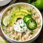 5. Combine and Garnish: Stir the shredded chicken and chopped fresh cilantro into the thickened chili. Serve portioned into bowls with a squeeze of fresh lime juice. Add additional toppings like diced jalapenos, avocado, sour cream or Greek yogurt, shredded cheese, and crushed tortilla chips as desired.