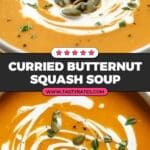 Creamy Curried Butternut Squash Soup infused with coconut milk and yellow curry powder. A savory, simple soup that’s perfect for fall and winter months, combining the natural sweetness of butternut squash with warming spices and a hint of heat from chili garlic paste.