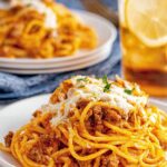 - Layer Meat Sauce: Spoon the simmered meat sauce over the Alfredo-coated spaghetti, spreading it evenly.