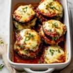 – Baking: Preheat the oven to 350°F. Brush a sheet pan lightly with 1-2 tablespoons olive oil. Arrange breaded eggplant slices on the pan and bake for 25 minutes until golden. - Assemble Casserole: Spread a generous layer of marinara sauce on the bottom of a large casserole dish. Layer with fried or baked eggplant slices, mozzarella cheese, a spoonful of marinara, and shredded parmesan. Repeat to create a second layer of eggplant, mozzarella, marinara, and parmesan.