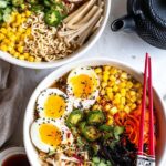 - Serve with Marinated Eggs and Garnish: Slice the marinated soft boiled eggs in half and carefully place on top of the ramen bowls. Garnish with additional green onions, jalapeño slices, and a sprinkle of sesame seeds before serving.