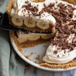 - Top the Pie: Spoon or pipe the whipped cream evenly over the banana layer, smoothing the surface gently. Finally, sprinkle the chocolate curls over the cream for a decorative and flavorful finishing touch.