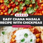 A delicious and healthy Chana Masala recipe featuring tender chickpeas simmered in a rich, spiced tomato sauce. This vegan dish is perfect served over rice and garnished with fresh cilantro and Greek yogurt for a creamy contrast.