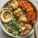 7. Assemble Bowls and Serve: Divide the creamy orzo among bowls and top with the roasted sweet potatoes and cauliflower. Serve each bowl with a generous dollop of hummus on the side for added creaminess and flavor.