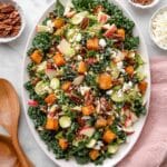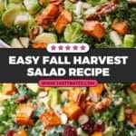 A vibrant and nutritious Fall Harvest Salad featuring roasted sweet potatoes, fresh kale, and Brussels sprouts, tossed in a creamy tahini dressing and topped with crisp apples, candied pecans, and feta cheese. Perfect for celebrating autumn flavors and packed with wholesome ingredients.
