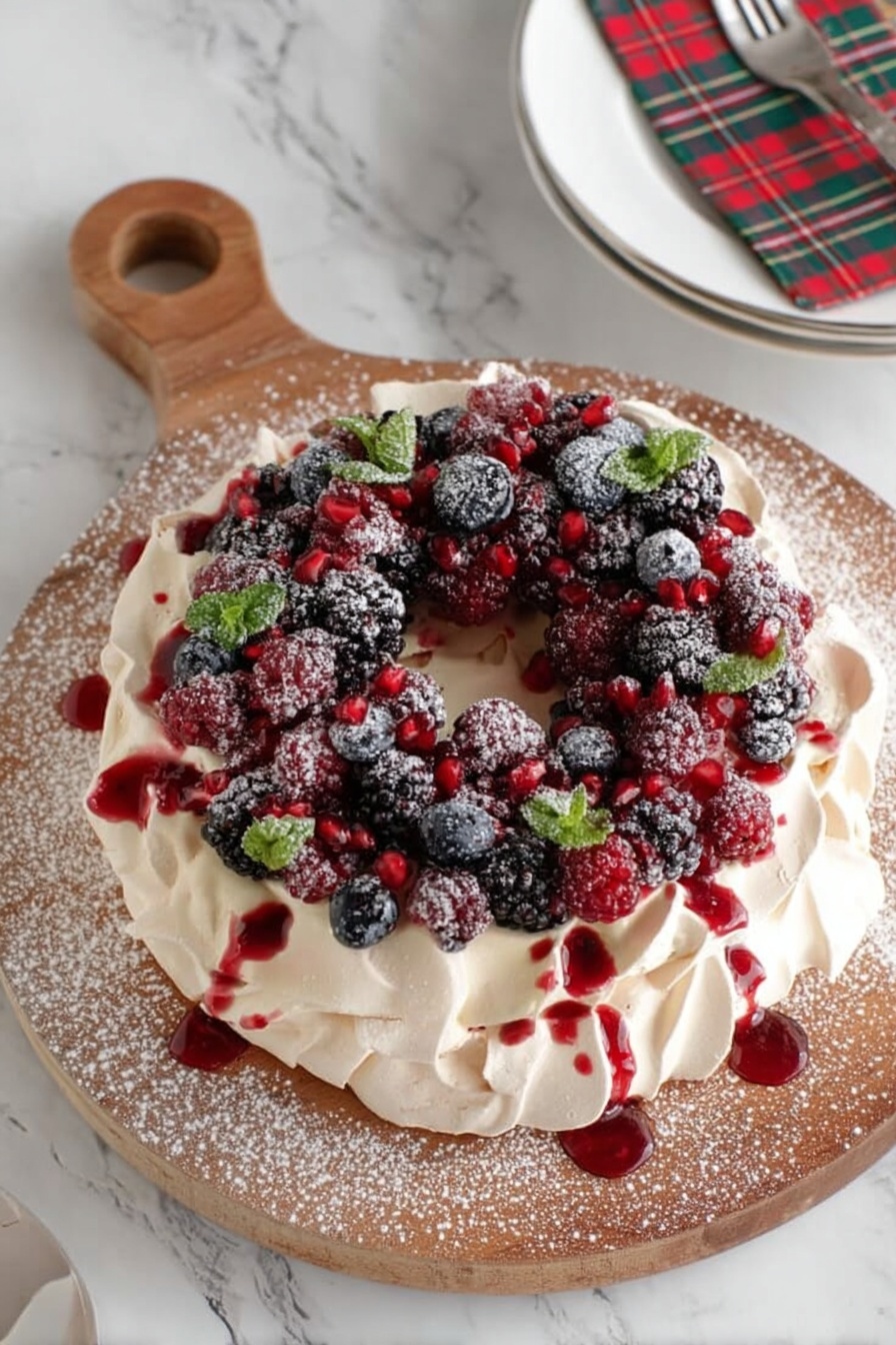 - This pavlova wreath is perfect for the festive season and can be customized with your favorite berries and seasonal fruits.