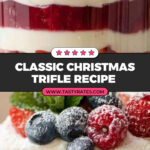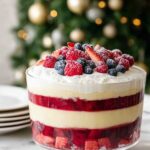 A classic festive Christmas Trifle featuring layers of Madeira cake soaked in fruit-flavored liquor or juice, homemade cranberry jelly, fresh berries, rich custard, and whipped cream, all assembled in a show-stopping trifle dish. This traditional English dessert combines bright flavors and textures, perfect for holiday celebrations.