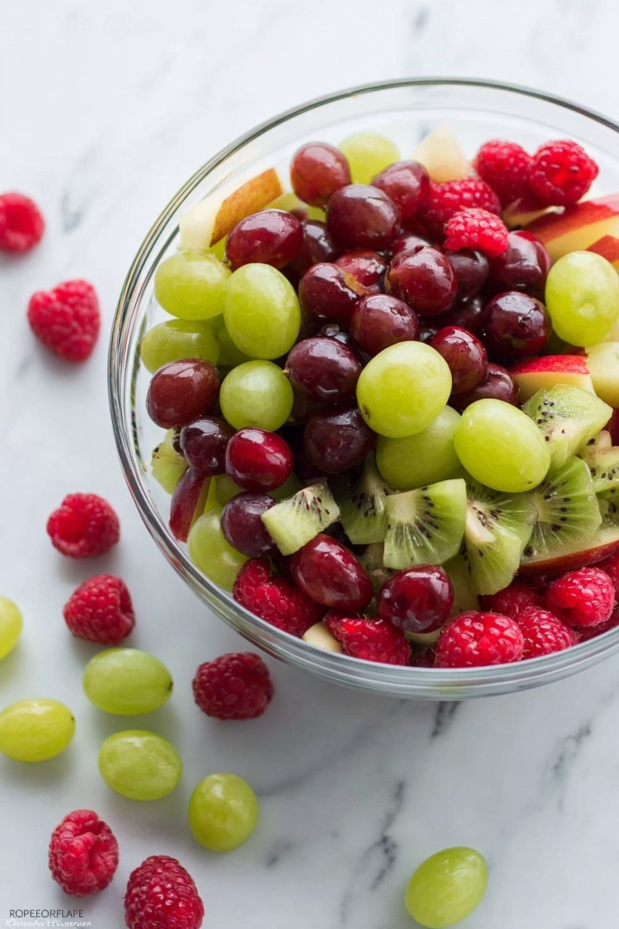 - Prepare the Fruit: Carefully combine the sliced Granny Smith apple, red apple, green grapes, red grapes, peeled and sliced kiwi, raspberries, and pomegranate arils in a large glass bowl. Be gentle to avoid crushing the raspberries.