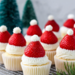 - Assemble Santa hats: Pipe whipped cream onto the center of each cheesecake. Top each with a strawberry, flat side down, pressing gently. Add a small dollop of whipped cream on the strawberry tip to complete the ‘hat.’