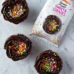These Chocolate Cauldron Cakes are perfect for Halloween or any fun occasion, featuring rich chocolate cupcakes filled with fluffy marshmallow cream and topped with fun sprinkles to resemble bubbling cauldrons. Finished with a luscious chocolate cream cheese frosting rim, these cakes are as delightful to look at as they are to eat.